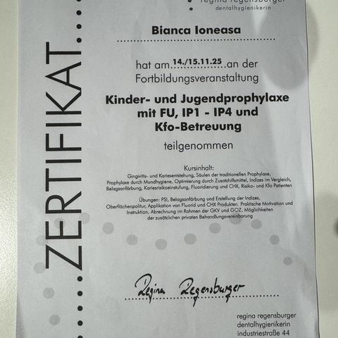 Unsere Auszubildende Bianca hat erfolgreich an einer Fortbildung zur Kinderprophylaxe (IP1, IP2 und IP4) sowie zur kieferorthopädischen Beratung teilgenommen. Dabei konnte sie ihr Fachwissen in den Bereichen kindgerechte Mundhygiene, Individualprophylaxe und der Aufklärung über mögliche kieferorthopädische Behandlungen erweitern. Durch die neuen Inhalte ist sie nun noch besser darauf vorbereitet, unsere jungen Patientinnen und Patienten einfühlsam, verständnisvoll und kompetent zu begleiten.