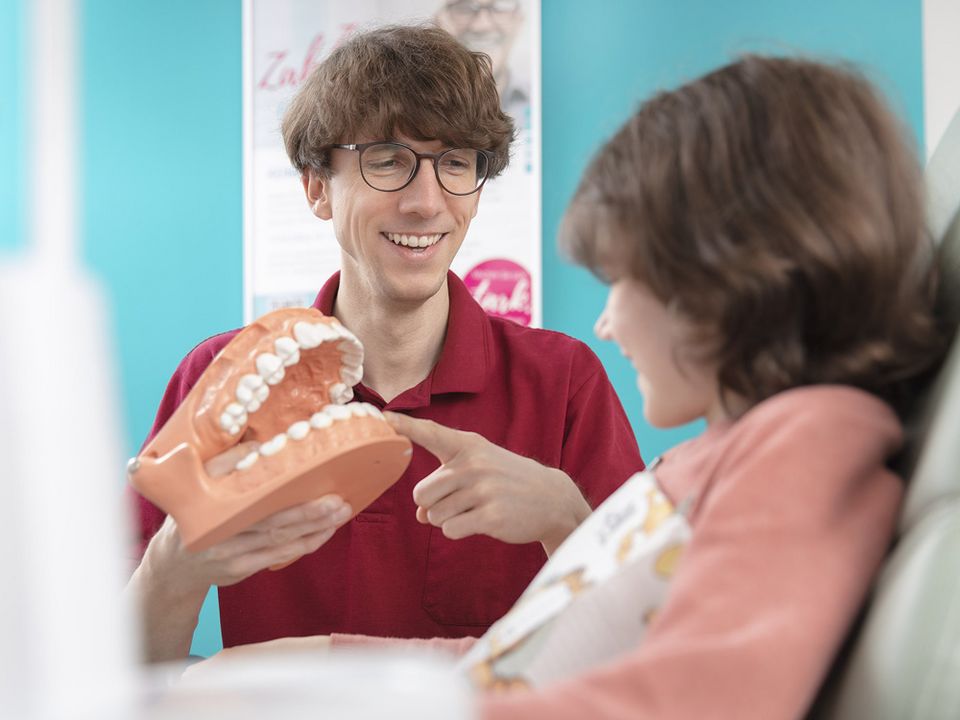 Neben der Kariesdiagnostik, der Versiegelung und der Kontrolle des Zahnwechsels gehen unsere Patienten ab sechs Jahren auch in die Zahnputzschule. Hier wird das individuelle Prophylaxeprogramm gemäß dem Alter und dem Zahnzustand angepasst.